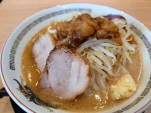 とにかくボリュームは文句なしです。麺にもやし、チャーシュー2枚、アブラ、ニンニクがトッピングです。