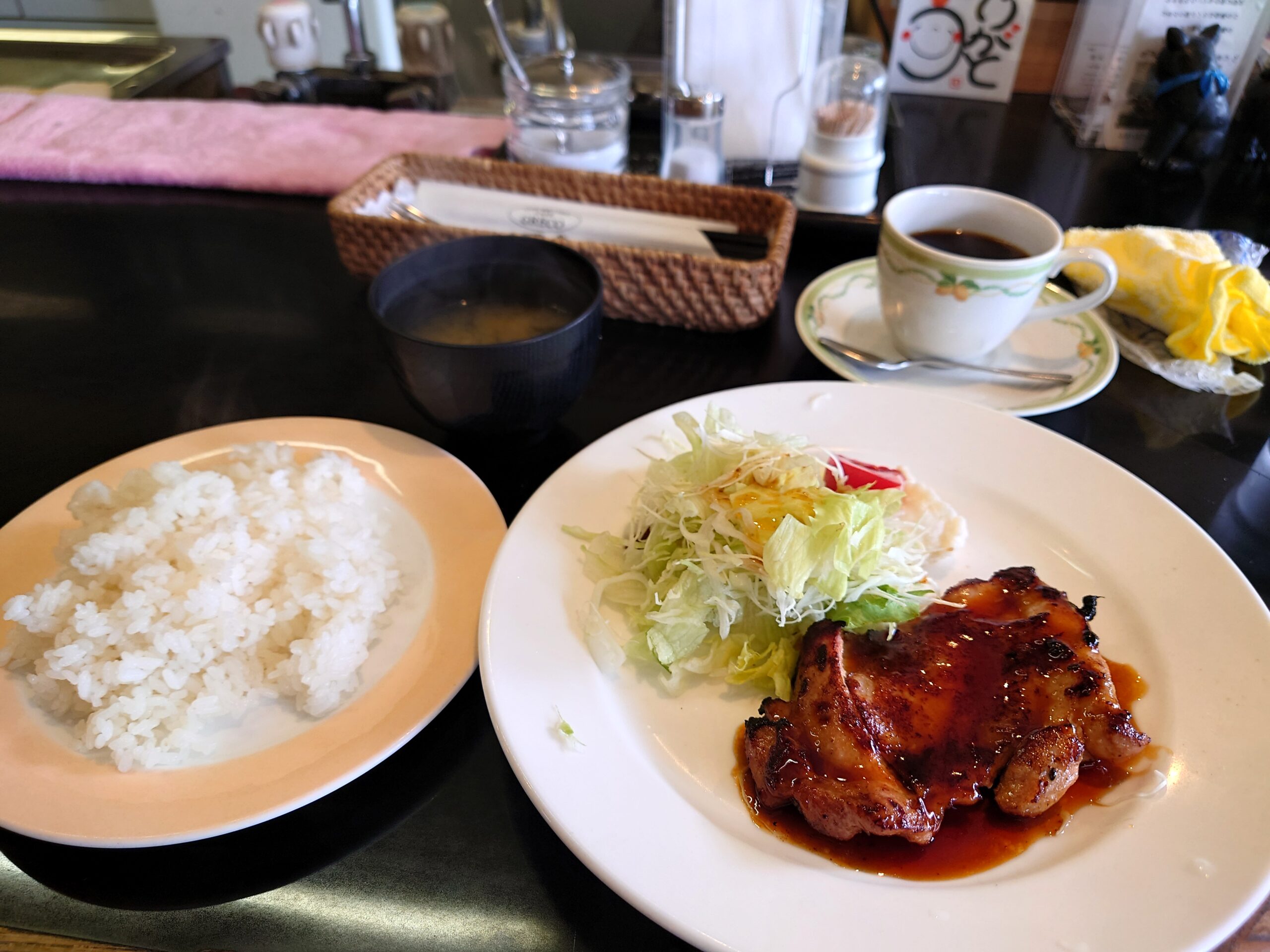 チキンの照り焼きって最近あまりお目にかかれません。懐かしくて注文しちゃいました。お味噌汁かスープがもれなく付いてきます。