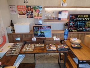 店内テーブルに日替わり商品を並べています。こちらは店頭に並べてある分だけですので、なくなり次第完売です。店頭にある商品は先にお取りいただき、券売機でお会計をお願いします。