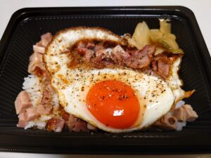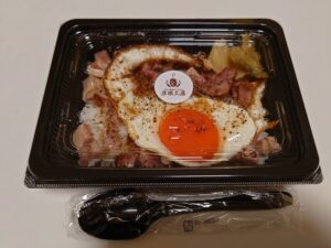 無添加・手作り感がすぐわかる肉飯弁当です。卵がしっかり焼かれているのがわかります。この半熟卵は注文受けた後の手作りでなければ作れません。