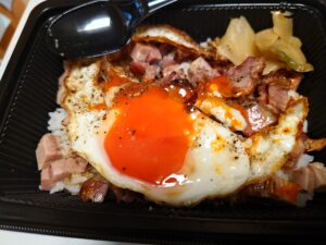 焼豚の刻みがごはんの上に置かれています。手作り出来立て目玉焼きですね。