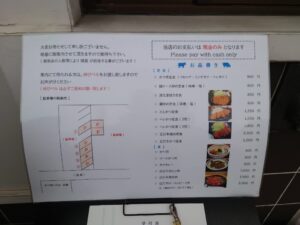 ▼こちらが店頭に掲げられているメニューです。店内にもメニュー表は用意されています。2023年4月再訪しました。コロナ過もあってテイクアウトも始めたみたい。テイクアウトでホテルや家で食べることも出来るようになりました。