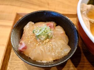 真鯛の甘さの軽く出汁醤油につかした風味がさっぱりしてめっちゃおいしい。ゴマとネギが触感のアクセント。