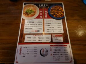 ディナータイムのみ限定メニューもあります。私的にはランチタイムは担々麺が良く売れている印象です。夜のディナータイムはゆっくり落ち着いてビールと麻婆豆腐定食をたしなむスタイルかしら